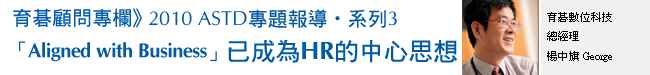 自2001年參加ASTD Conference 以來,所有議題中,對我影響最大的就是在2007年參加IBM ASTD Excellence in Best Practices Awards案例分享中,聽到了IBM 的輔導顧問 Dr. Reza Sisakhti對人才發展架構的解析與介紹,說明了人才發展要能「Aligned with Business」的重要性及趨勢;今年也不例外,更加強調也驗證了其已不再是口號或理想;只要透過完善的人才發展架構的規劃與執行,同時藉由此架構建立團隊共識,協助員工學習成長,即可提升顧客服務品質,進一步創造營運績效。