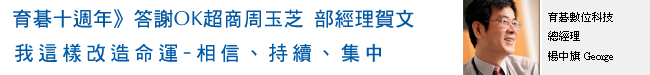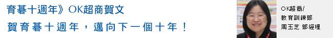 此次特別感謝OK超商周玉芝部經理的十週年賀文,如同周部經理所言,"十年,看似很長的時間,卻只是下一個階段開始前的基礎,人生與企業都是十年又十年不斷累積的過程。在此除了祝賀育碁十年有成,也期待育碁的下一個十年,繼續開拓出更精采的未來! "。育碁的下一個十年,因為有"客戶為師"的砥礪,將持續專注在LMS/eHRD企業人才培訓與發展領域中,開創出更精采的佳績!