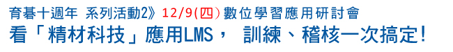 歲末年終之際,各家企業即將如火如荼的展開半年度或年度的職能評量、績效考核、明年度訓練規劃…等專案。育碁十週年特別規劃了一系列的活動,將各成功應用案例持續分享給各企業客戶,即將登場的12/9(四)數位學習應用研討會,活動中除了介紹LMS系統的各種應用成效案例外,更特別邀請「精材科技」分享其如何應用LMS,讓訓練、稽核一次搞定!有效提升訓練時數及開課量,且報表匯整及文件簽核作業時間更大幅縮短了60-70%。