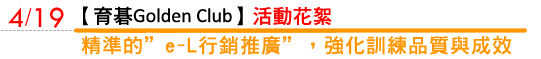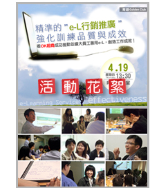 活動花絮: 1.背景 2.eL行銷推廣心法:Promote 應用的成效 ,不是Promote 參與課程 ( Success Leads Success ) 3.eL行銷推廣方法:小行銷(活動) , 大推廣(成效)! 4.eL行銷終極目標:讓eL成為公司DNA的一部份 (...完整花絮報導)