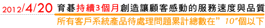 2012/1/16-4/20期間,育碁已經成功"持續三個月創造"讓顧客感動的服務速度與品質-所有客戶系統產品待處理問題總數在10個上下。 "售後服務速度與品質"常被汲汲營營爭取於客戶訂單的供應商所忽略,育碁認知一個好的領導廠商,不僅在客戶數與市場佔有率上領先,更要能在問題解決與服務品質上創造不同層次的領先,來引領同業共同為HRD導入的效益與服務的品質努力;才能創造整合科技的應用效益,以促進企業人才發展的績效,同時發揮產業的關鍵價值!更是獲得客戶信賴,而敢於有長期投資,成為貢獻台灣產業競爭力重要的一環。 .... (完整資訊)