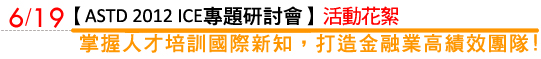 台灣金融研訓院與育碁,於6/19共同主辦的【ASTD 2012 ICE專題研討會】活動,短短2周報名期間,總共吸引了200多位企業HR、單位主管等的報名,感謝當日與會來賓的熱情參與,讓活動互動熱絡,圓滿成功!