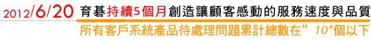 2012/1/16-6/20期間,育碁已經成功"持續五個月創造"讓顧客感動的服務速度與品質-所有客戶系統產品待處理問題總數在10個上下。 "售後服務速度與品質"常被汲汲營營爭取於客戶訂單的供應商所忽略,育碁認知一個好的領導廠商,不僅在客戶數與市場佔有率上領先,更要能在問題解決與服務品質上創造不同層次的領先,來引領同業共同為HRD導入的效益與服務的品質努力;才能創造整合科技的應用效益,以促進企業人才發展的績效,同時發揮產業的關鍵價值!更是獲得客戶信賴,而敢於有長期投資,成為貢獻台灣產業競爭力重要的一環。 .... (完整資訊)