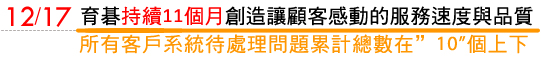 | 2012/1/16-12/17期間,育碁已經成功"持續11個月"創造讓顧客可以高度信賴的服務速度與品質-所有客戶系統產品待處理工程問題總數在10個上下。問題範疇包含:a+HRD全系統(a+KPI, a+LMS, a+Learning Roadmpa, a+Competence, a+MRA, a+IDP, a+MPS)…、客戶客製整合功能包含跨版本(Q+2.X, a+3.X, a+4.X, a+5.X)、所有維護(MA)服務中的舊案,及導入測試中的新案。