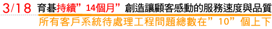 2012/1/16-2013/3/18期間,育碁已經成功"持續14個月"創造讓顧客可以高度信賴的服務速度與品質-所有客戶系統產品待處理工程問題總數在10個上下(2012年一整年全紀錄)。問題範疇包含:a+HRD全系統(a+KPI, a+LMS, a+Learning Roadmpa, a+Competence, a+MRA, a+IDP, a+MPS)…、客戶客製整合功能包含跨版本(Q+2.X, a+3.X, a+4.X, a+5.X)、所有維護(MA)服務中的舊案,及導入測試中的新案。