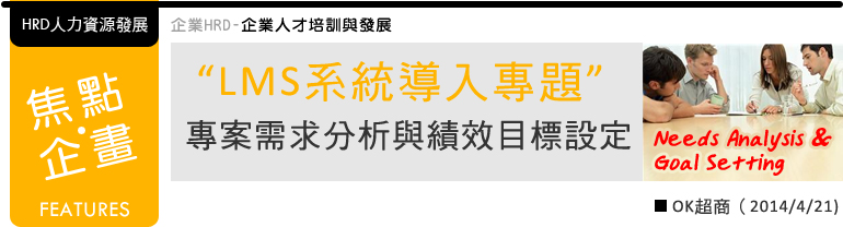 OK超商在2005年4月決定導入數位學習系統後,即在2005年7月18日平台開台,並且同步上線新進人員訓練課程。因為新進人員訓練是第一個導入的專案,所以專案需求的分析就不能只單純考量如何讓課程上線,也必須同時考量如何讓LMS系統順利的導入,才能讓課程上線成功。尤其使用者對第一個上線專案的接受度,會決定後續專案的推動成功率,所以專案更需仔細分析、謹慎執行。....(完整文章) |