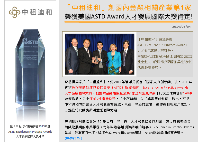 14年這一路走來,經驗與專業的累積,除了我們自己的努力,更有不少的貴人、導師、與專家們的扶持與指引。更關鍵的是,每個客戶都是我們的老師,督促著我們專業與服務品質的精進;2014年育碁14周年之際,也是我們深感喜悅的一年,育碁的長期標竿客戶之一「中租迪和」今年榮獲美國訓練與發展協會(ASTD)所頒發的「Excellence in Practice Awards」人才發展國際大獎,創國內金融相關產業第1家企業獲此殊榮!(此次全球共計有140件參賽作品,僅有9件獲此殊榮) 看到客戶成功的應用模式與成效時,除了深感榮幸之外,更讓我們覺得一切的努力都是值得的!