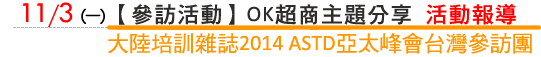 2014年真的是台灣HR發光的一年,不僅有「中租迪和」率先獲得ASTD Excellence in Practice Awards, 相繼還有廣達、高雄市政府、台北醫學大學附設醫院,獲得ASTD Best Awards. 2014 ASTD APC(Asia Pacific Conference) 也於11/1圓滿落幕。