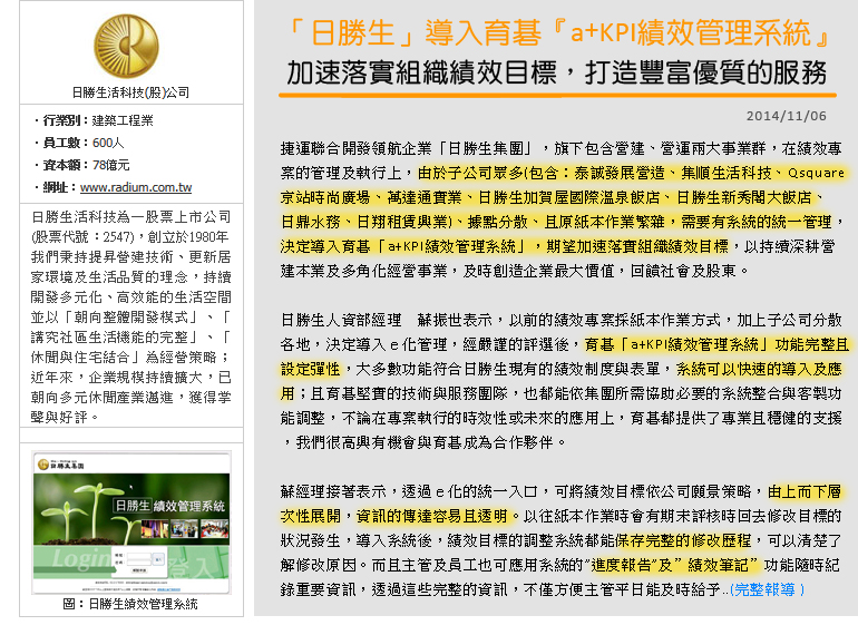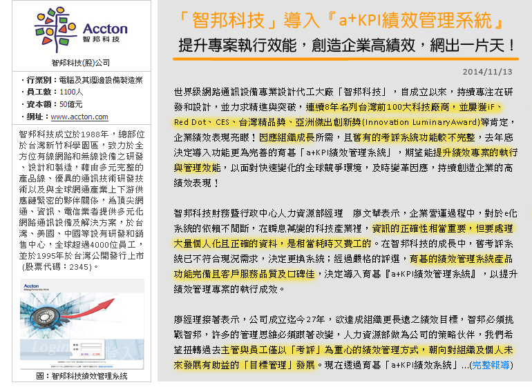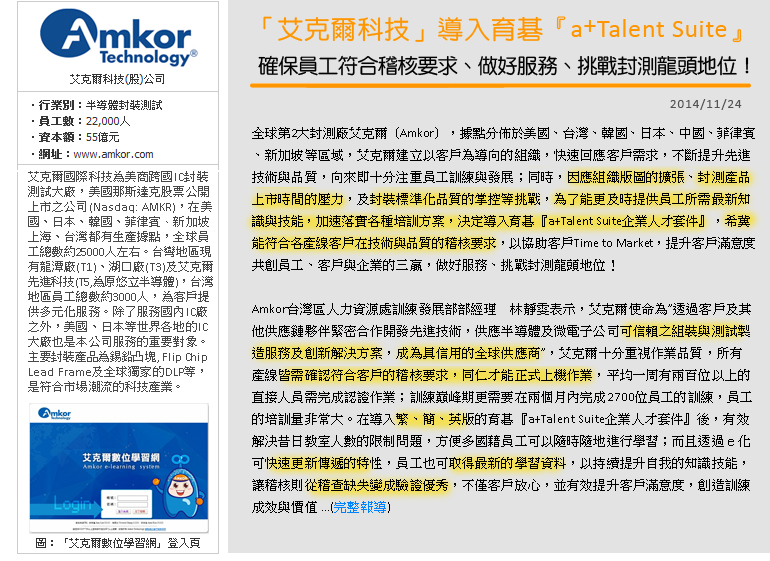 除了來自國際的大師分享,在國內不管是LMS還是KPI的系統應用也持續普及,本期電子報也匯整了「艾克爾科技」、「智邦科技」、「日勝生」等標竿客戶的系統應用報導;同時,非常高興的是今年能與國內優質的全媒體智庫「天下創新學院」共同合辦企業人才培訓與發展論壇,活動更特別邀約服務業及科技業標竿客戶「元大金控」與「明基材料」,分享其寶貴的實務應用經驗,期望能協助國內企業可以成功結合並善用e化,規劃一務實且有效的員工培訓方案,以快速應變市場挑戰,持續開創台灣的人才競爭力。