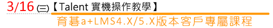 │時間│3/16(三) 1:30-4:30 PM │對象│a+LMS 4.x/5.x客戶之HR、培訓管理者,欲進行LMS 管理者端功能的學習與複習者 名額│ 10位(每家公司限1人,額滿為止) 費用│.自備NB者,免費; .未自備NB者,每人僅收設備支援費NT$500 .同一家公司第二位以上報名需酌收NT$1,000(超過場地容納人數時,將列入候補名單) │報名方式│ 線上報名。或請洽育碁專屬客服經理
