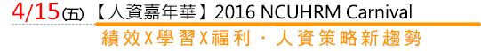 國立中央大學人力資源管理研究所將在105年4月15日(五)、16日(六)舉辦【中央人資嘉年華】系列活動,其中,4月15日(五)為人力資源管理專題研討會,特別邀請人資專業領域教授及企業資深人資主管,就HR專業主題分享最新的發展趨勢及企業應用實務,除了歡迎本所校友返校聯繫感情外,也期望帶給所友們領域新知,彼此教學相長,再創人資新高峰!