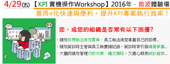 │時間│4/29(五)13:30-17:00 │對象│ 1. 負責績效考核專案的HR /績效專案執行同仁 2. 負責規劃導入KPI系統的專案主管 3. 育碁其它產品客戶_加購KPI系統應用評估者 │地點│台北恆逸電腦教室 - 台北市復興北路99號 │費用│NT$2,000 /每人 │報名方式│ 線上報名