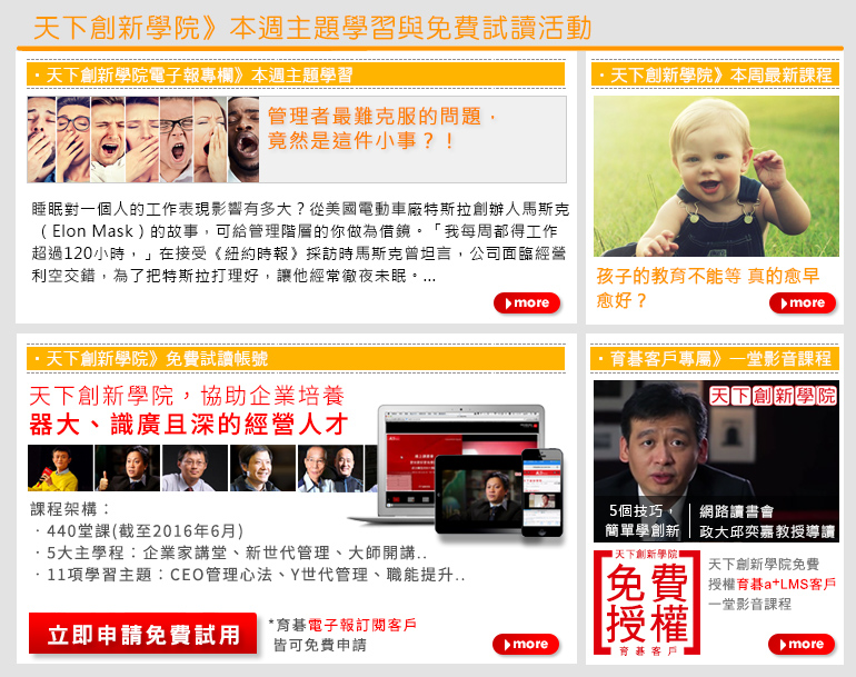 2018年10月26日,天下雜誌的企業內訓知識平台「天下創新學院」,發表〈2000大企業人才調查報告分析〉,現場同時頒發「年度學習獎項」。發揮與育碁系統的整合效益,育碁客戶成為「天下創新學院」年度學習獎項大贏家,「元大金控」、「玉山銀行」、「新光銀行」、「康軒文教」榮獲「天下創新學院」年度眾多學習獎項,展現員工學習競爭力,藉由「天下創新學院」優質的數位內容,培養員工對市場敏感度,強化各核心能力!。