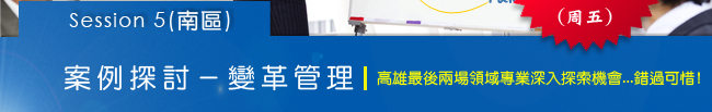 場次5,將由顧問針對過去不同的變革成功案例進行深入觀點的觀察,提出實用的提醒建議,延伸並深化實例的分享與交流,協助各位達到事半功倍之效益。