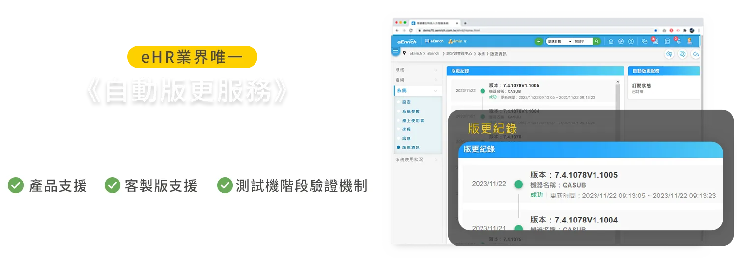 隨著客戶數的增加,育碁主動提供《自動版更服務》,透過 aEnrichUpdate 自動化版更機制,整合「版本偵測、更新推送與自動安裝」,全面簡化企業系統升級流程;客戶無需負擔繁瑣的人力時間協調與手動操作,即可讓系統加速取得包含資安精進等各項更新,長期維持在最佳版本狀態,不僅有效降低維運風險與成本,更可提升客戶系統穩定與資安防護。