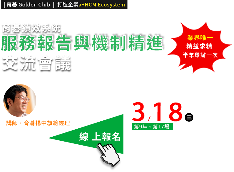 針對關鍵系統的尖峰應用時刻,近百家績效系統企業客戶集中使用,如何做到優異的service level?3月18日上午10:00誠摯邀您來共同見證”報表的解讀分析”與解密”預防重於治療的機制”,見證育碁在eHRD市場中,百萬級以上績效管理系統新客市佔率近約90%的核心競爭力!
