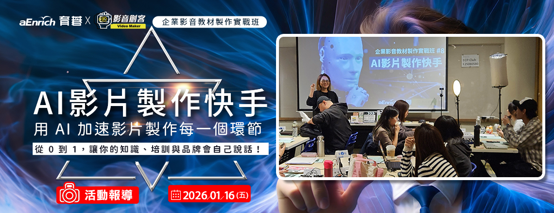 此次課程採「混成學習」模式,除了《實體課》長達7小時的實戰演練班之外,也特別結合育碁「a+LMS 8.x 學習管理系統」及「影音創客」的AI影片主題《線上課程》,提供所有學員為期一個月的時間,方便學員利用零碎時間,隨時上線學習與複習、強化並提升此專題學習成效;同時也期望藉此課程,提供育碁客戶們體驗「混成學習」模式,進一步了解如何結合育碁「a+LMS 8.x 學習管理系統」進行組織內訓的混成學習,以啟發更多元的應用,持續提升企業員工各主題的學習成效。