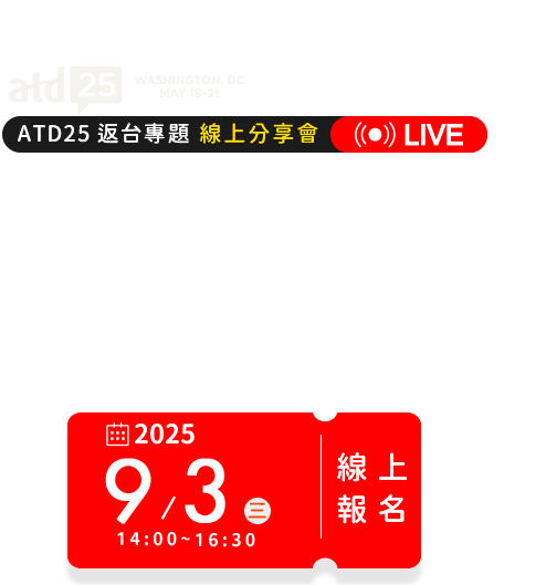 全球最大人才發展盛會 ATD25 已於 5 月盛大落幕,今年以「Collective Insights. Lifelong Learning.」為主題,強調持續學習與人才韌性的關鍵價值。想了解在 ATD25 大會中,全球專家們如何運用 AI 驅動人才學習、賦能個人化發展體驗,並建構新一代的績效學習架構?