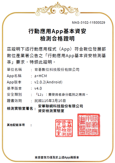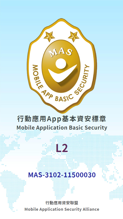 本次認證涵蓋 iOS 與 Android 雙平台,由符合 ISO/IEC 17025 國際標準之專業實驗室進行檢測,通過「Mobile Application Basic Security(MAS)」行動應用 App 基本資安檢測基準,並取得合格證書。