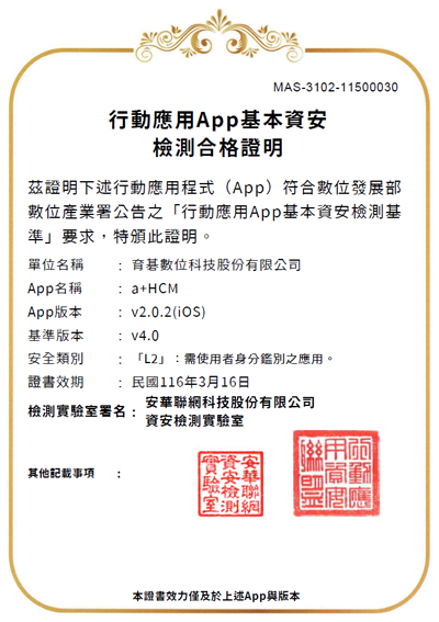 因應企業對行動資安的高度要求,國內整合性 HCM 廠商「育碁」持續強化行動應用安全機制。「a+HCM App 2.0.2」已於 2026 年 3 月 16 日正式通過 MAS 資安標章認證,為育碁第四度取得此項標章,進一步鞏固企業客戶在行動應用上的資安信任基礎。