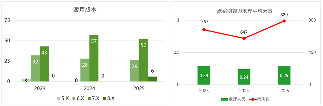 ▌2022~2025年PMD/KPI期末案例類型與平均處理時間: 育碁同時敏捷服務84+家績效管理系統客戶,平均每家客戶約10.6個案例,每個案例平均處理時間為 0.29天,對比去年,今年總案例增量37%,育碁持續展現敏捷化服務!