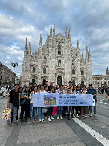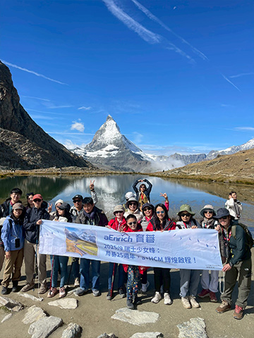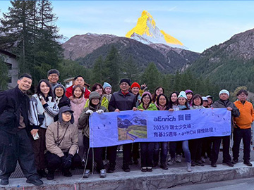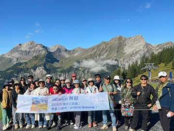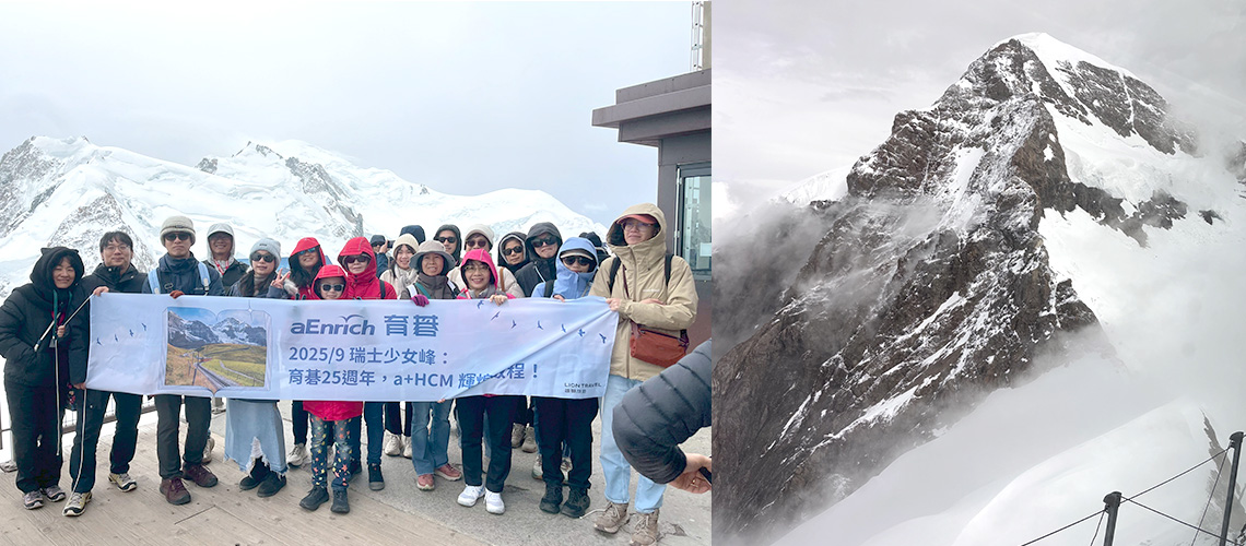 在產品研發上,我們以 「少女峰計畫」作為 a+HCM 8(含 a+HRM)開發計劃的代號(nickname),象徵攀登新高度與創新突破。為慶祝a+HCM 8.x成功上市及育碁25周年,公司特別安排兩梯次員工少女峰歐洲行。(本次員旅因費用較高,公司提供員工半額補助,感謝員工及親屬們的熱情參與;部份未參與此兩梯次的員工,選擇了日本北海道或九州的行程),此次員旅由許世杰Robert副總擔任企畫,並於9/8帶領第一梯完成旅程。行程中,兩梯次同仁不僅登臨海拔 3,454 公尺的「Top of Europe」少女峰車站,眺望壯麗的少女峰峰頂,也造訪了南針峰(Aiguille du Midi,並遠眺白朗峰 Mont Blanc),以及馬特洪峰(Matterhorn),一路領略歐洲阿爾卑斯群峰的壯麗與震撼,象徵育碁團隊在工作與生活上,同樣勇於追求卓越與創新的堅定決心。