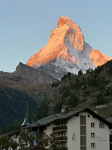 第1梯:「馬特宏峰」日照金山 陽光灑落馬特洪峰山頭,將整個山頭染成金黃色 |
